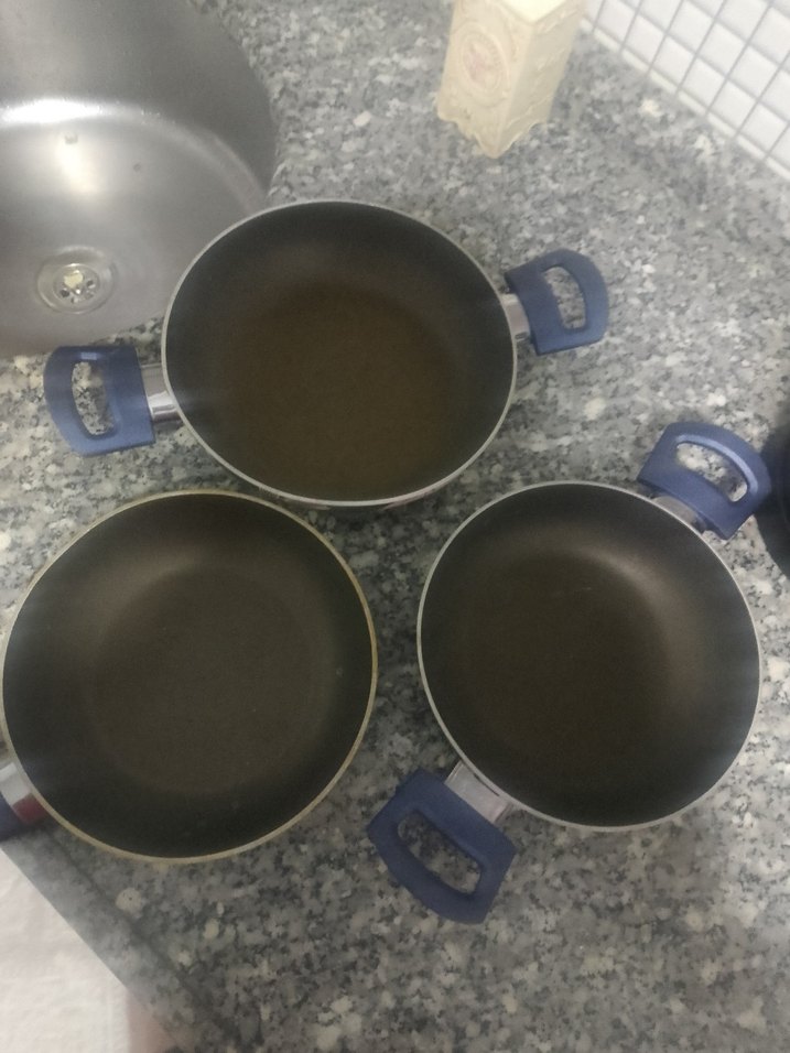 Mavi saplı koyu renkli tencere ve tavalar, farklı yemekler için uygun. Set, çok amaçlı kullanım için çeşitli boyutlarda.