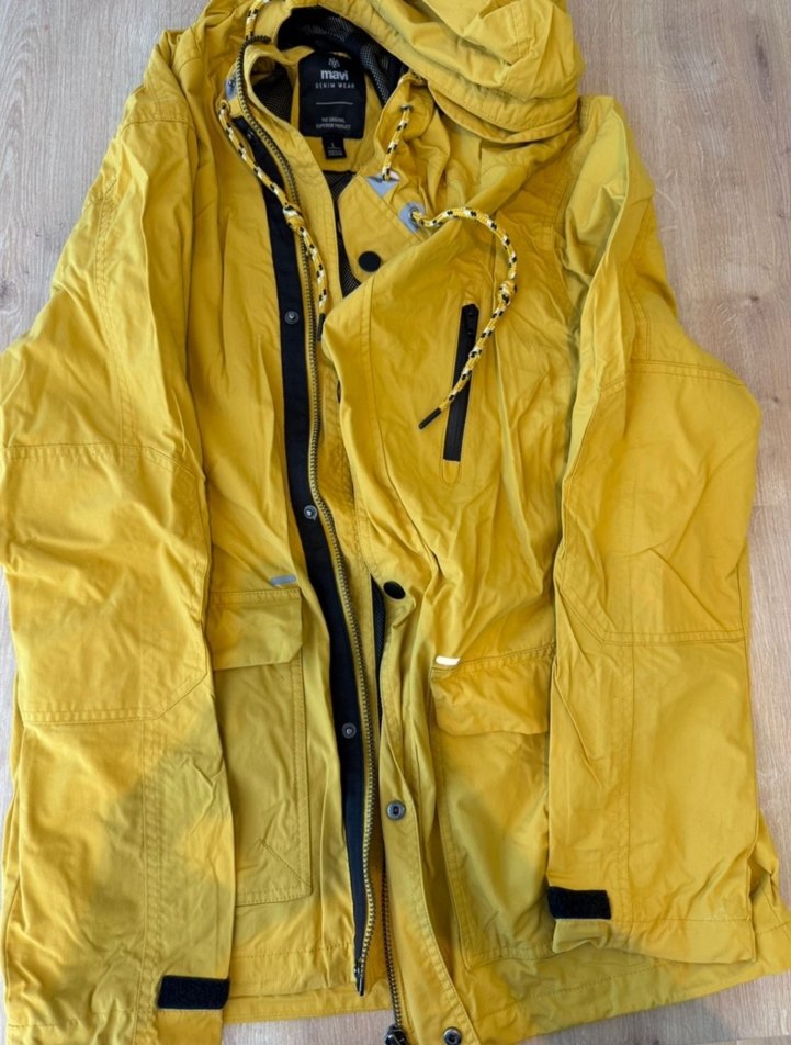 Sarı renkli, parlak sentetik kumaştan yapılmış, fermuarlı ve notalı yaka detaylı erkek midi boy rüzgarlık mont. Rahat kesimi ve uzun kolludur, dış mekan için uygundur. ️çok nadir olarak kullanıldı