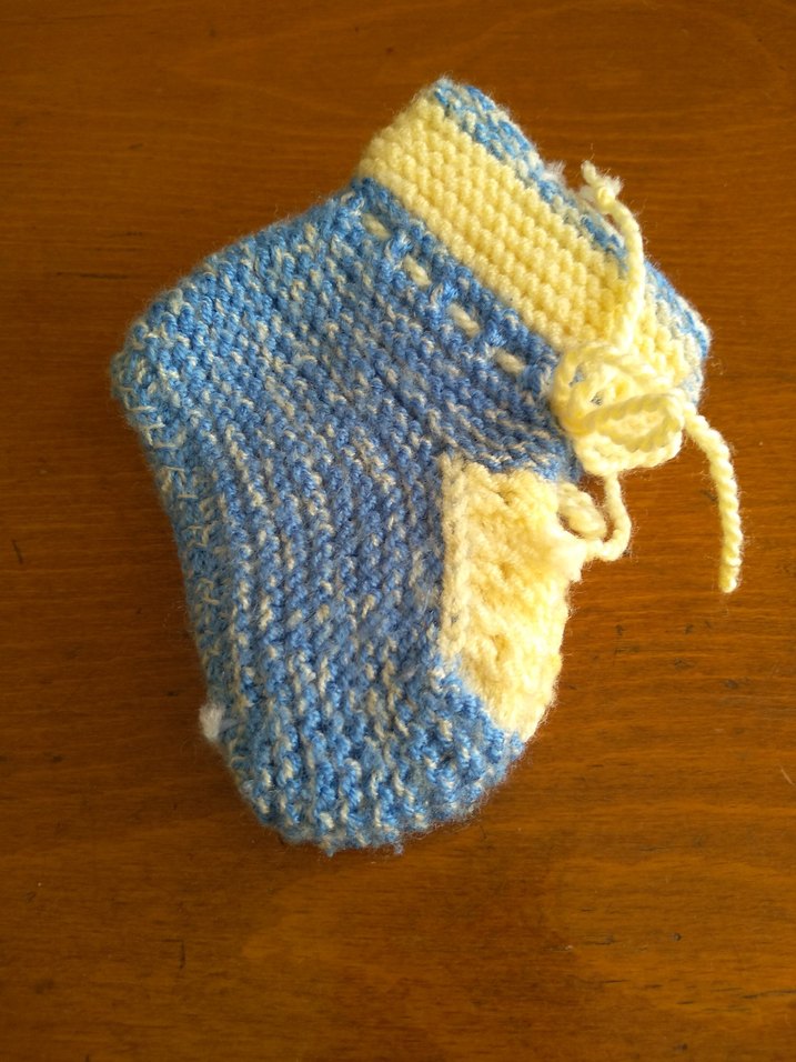 Mavi ve sarı renklerde, yumuşak örgü bebek patik. Sade ve klasik tasarıma sahip, renkli ve rahat.