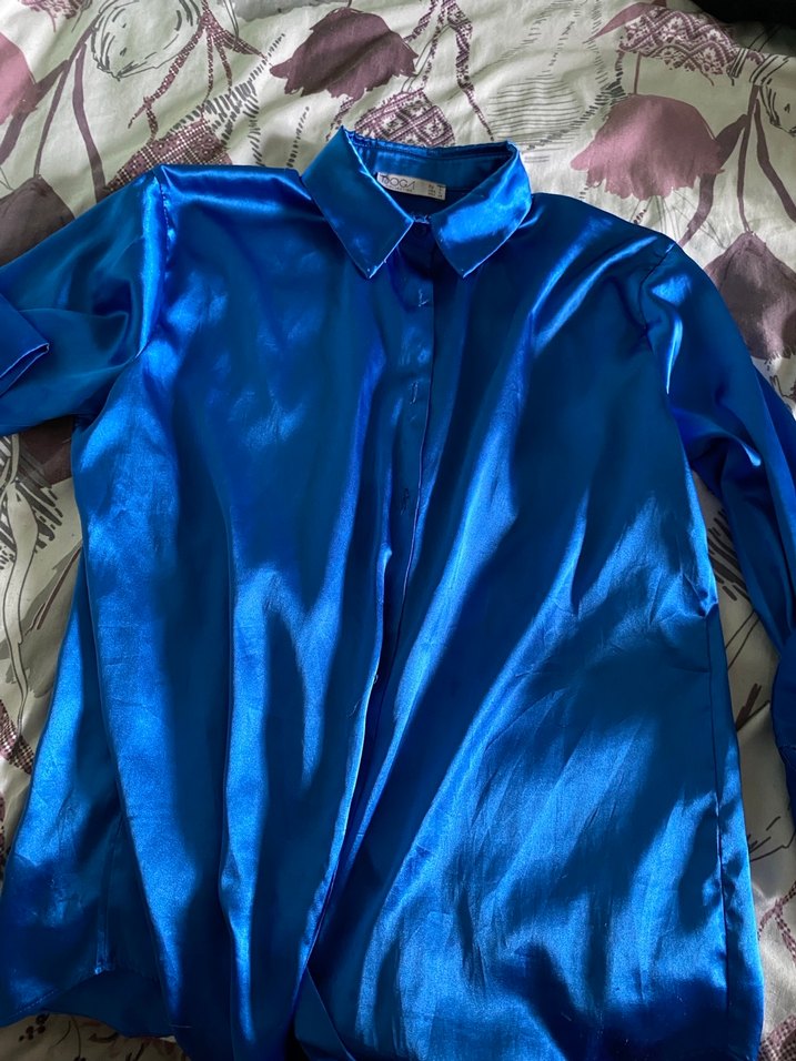Parlak mavi, saten kumaştan, düğmeli, uzun kollu, yakalı ve midi uzunlukta rahat kesim kadın gömlek. Günlük sokak tarzına uygun.