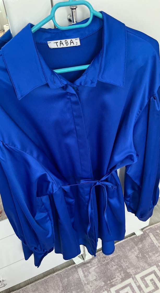 Mavi, saten kumaştan yapılmış, düğmeli ve yakalı, uzun kollu bol kesim kadın gömlek. Parlak dokusu ile ofis kullanımı için uygundur. Marka: TABAI. Ben 163 boyun kilom 49 bana istediğim gibi oluyordu belinden bağlaması olduğu için her beden giyebilir bence bir kere giydim