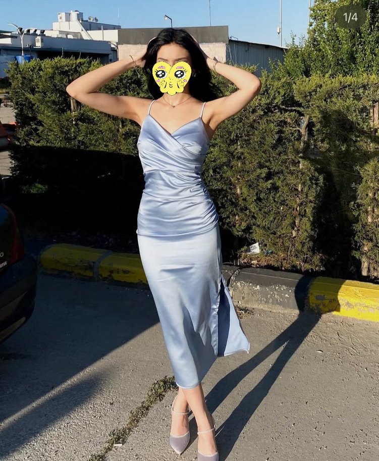Bu mavi, pastel tonlarda, drapeli ve askılı uzun elbise, ipeksi dokusuyla parti için uygundur. ✨ Bir kere ben bir kere de arkadaşım giydi sadece 2 kere kullanıldı yırtmacını ben bilerek biraz açmıştım gördüğünüz kadardır bazı yerlerinde çok minik ip çekmeleri var kalıbı dar xs-s olabilir askılardan birisi kırılmış ama kopmamış tutuyor