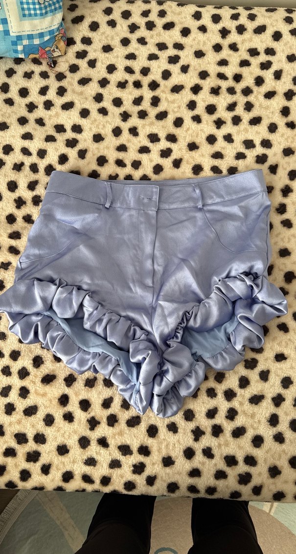 Parlak mavi, saten kumaştan olan bu mini şort, bol kesim ve etek ucu fırfır detaylarına sahiptir. Moda sokak stili için uygundur.