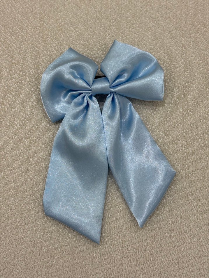 Pastel mavi renkte, saten kumaştan yapılmış fiyonk şeklinde sade ve şık bir bohem saç aksesuarı.