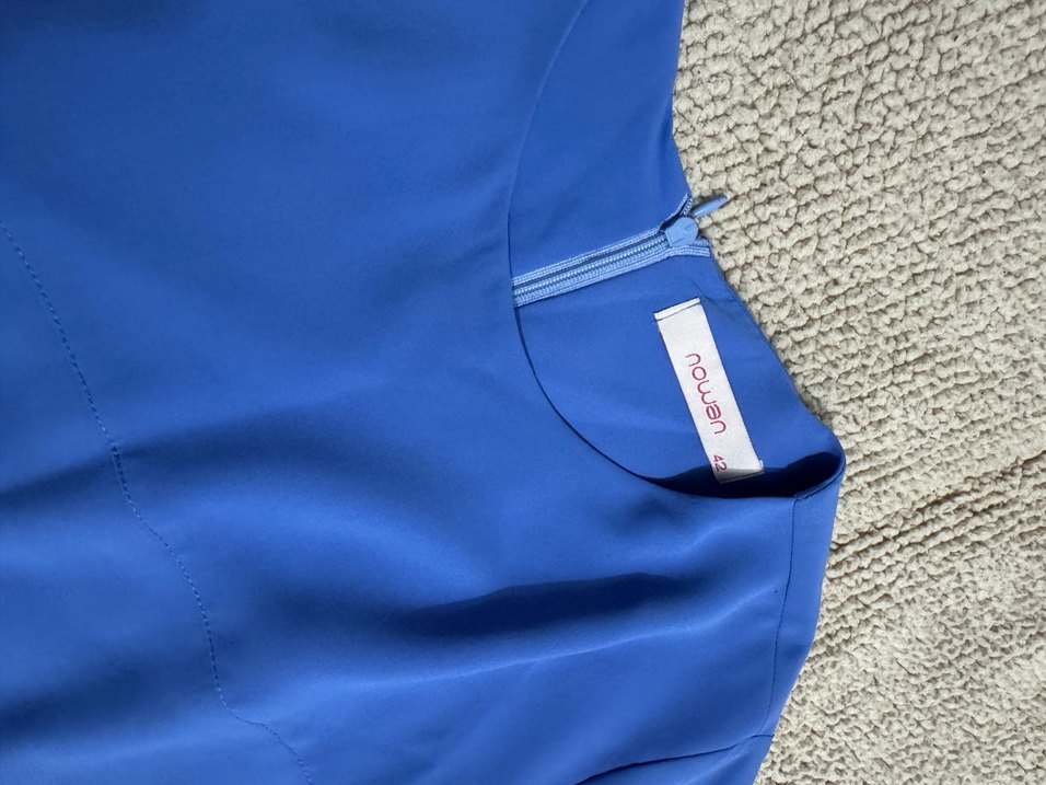 Mavi renkli, saten görünümlü, fermuarlı ve kolsuz hamile bluzu. Yakası yuvarlak, normal boyda ve hafif nakışlıdır. Günlük kullanıma uygundur. Marka Nowan.