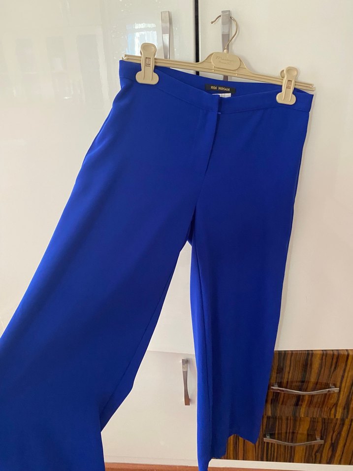 Parlak mavi, saten görünümlü, kemerli midi uzunlukta, regular fit kadın pantolon. Ofis ve günlük sokak stili için uygundur.