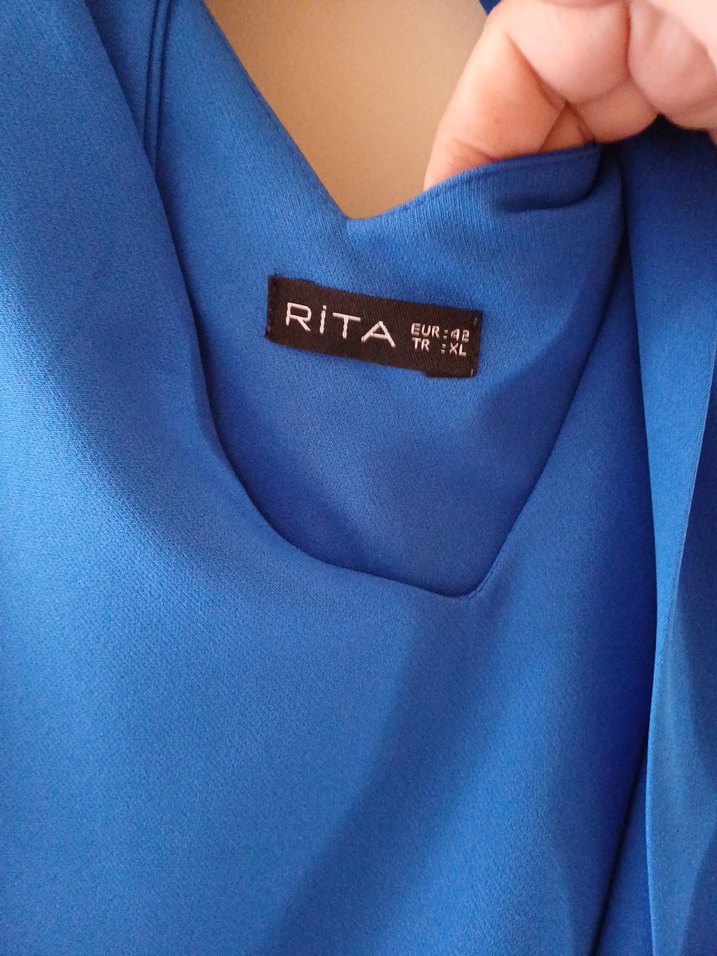 Mavi saten görünümlü, V yakalı,. Ofis stiline uygun,