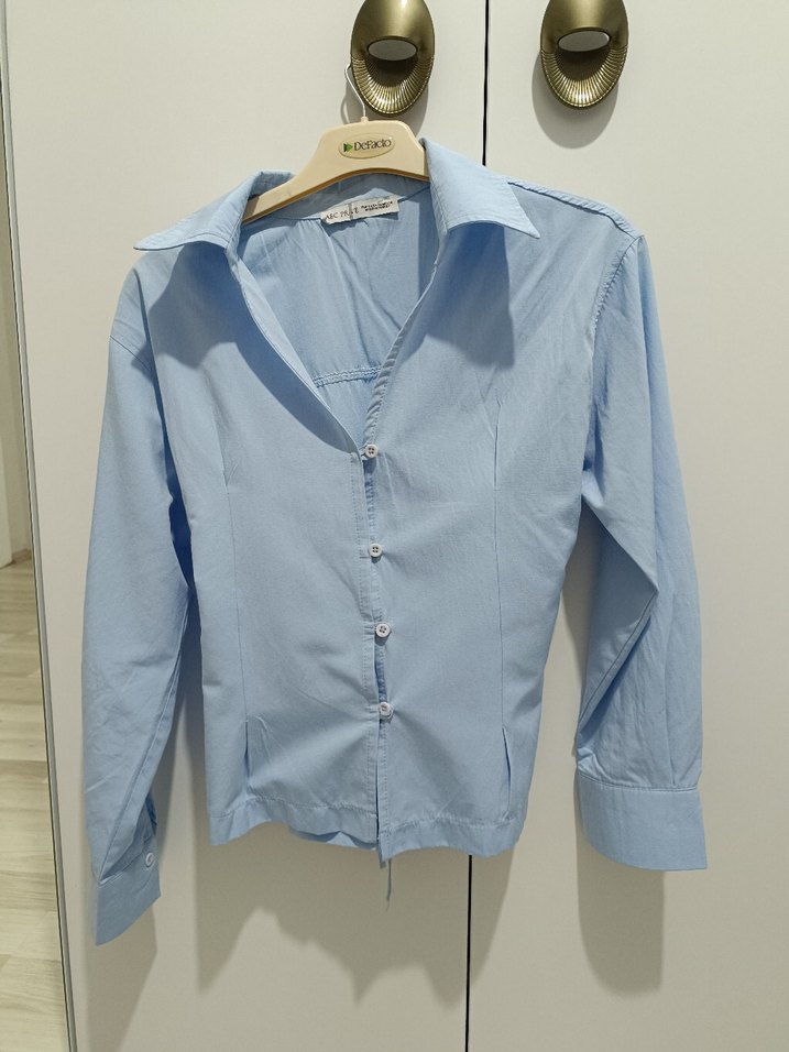 mavi saten kumaştan üretilmiş, düğmeli ve uzun kollu kadın gömleği. Regular kesim ve midi boyda, ofis ve günlük sokak stiline uygundur sağ bel kısım bagciginda küçük bir kopma oldu onun dışında sıkıntısı yok
