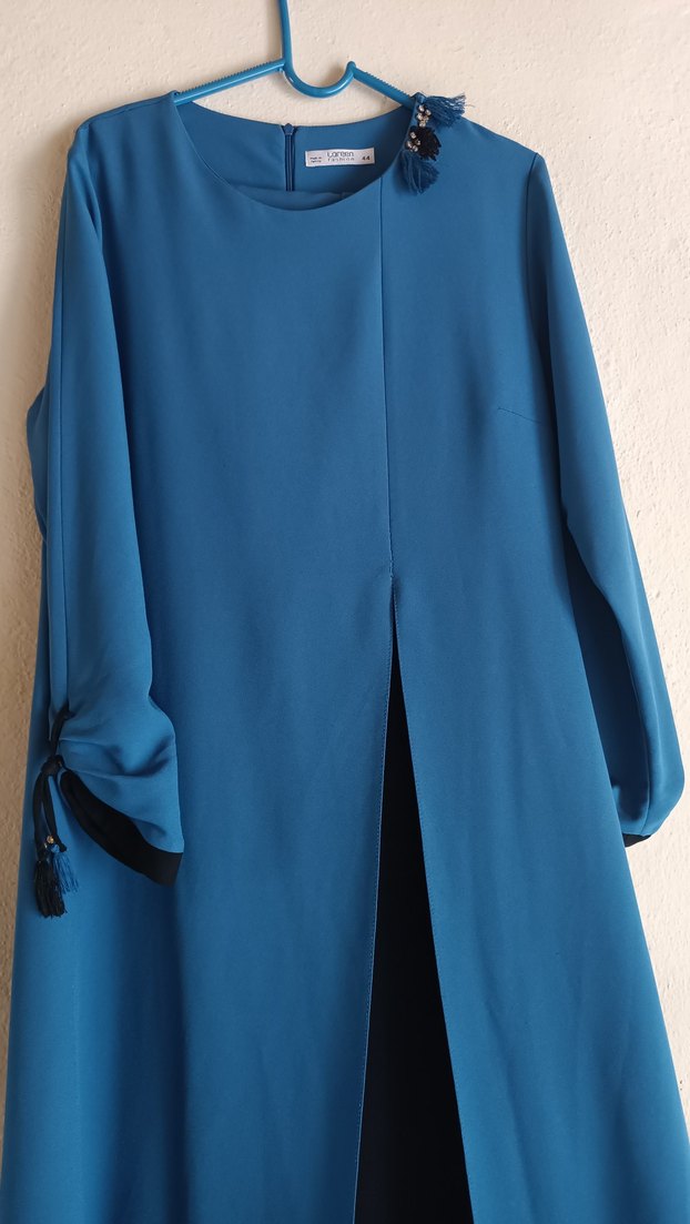 Mavi, parlak saten kumaştan, tunik takım pantolonuyla beraber çok iyi durumda bir defa giyildi
