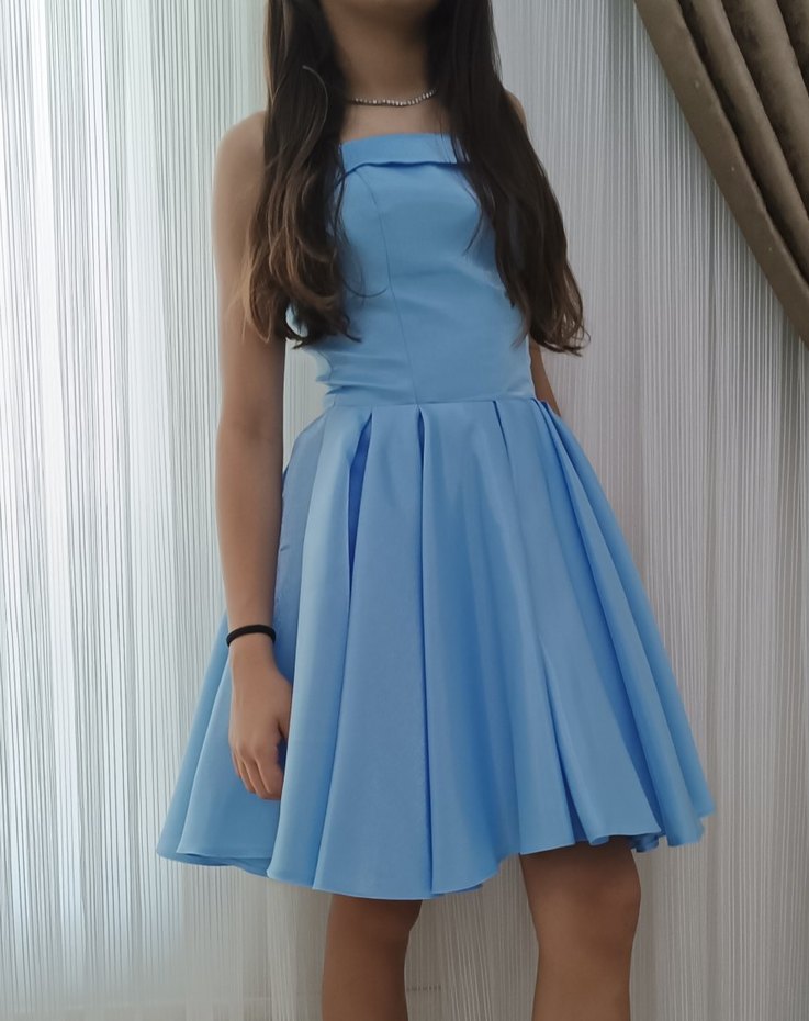 Pastel mavi renkte, straplez yaka ve drapeli, bol kesim midi uzunluğunda abiye elbise. Kolsuz, çağdaş tarzıyla parti ortamlarına uygun, Paris etkisi taşıyor. Mezuniyet partileri içinde uygundur.