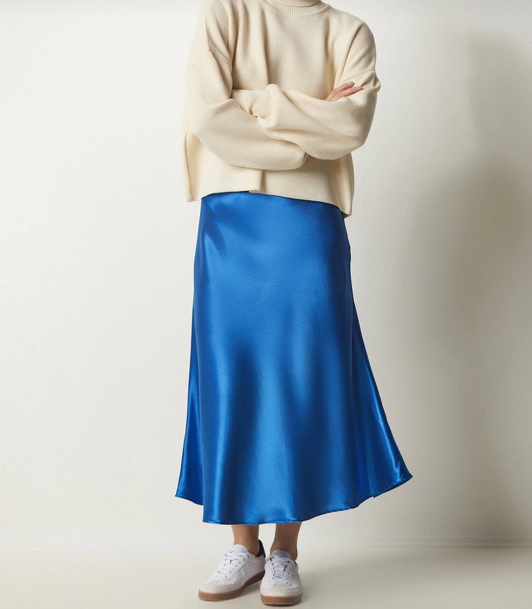 Mavi saten kumaştan, salaş kesim ve drapeli midi etek, minimalist ve çağdaş tarz sunar. Günlük kullanıma uygundur.