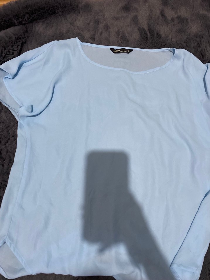 Mavi pastel renkte, saten görünümlü, kısa kollu ve yuvarlak yakalı bol kesim.Günlük kullanım için rahat ve şık bir tercih.