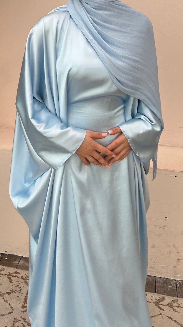 Saten kumaştan, uzun kollu ve yüksek yakalı mavi pastel tonlarda, drapeli, uzun boy hamile abiye elbise. Modest ve minimalist tarzda, düğün için uygun.