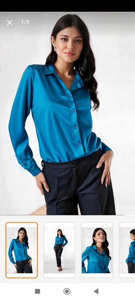 Mavi saten gömlek, V yakalı ve düğmeli uzun kolludur. Normal kesim ve parlak yüzeye sahip, ofis için uygundur. ✨