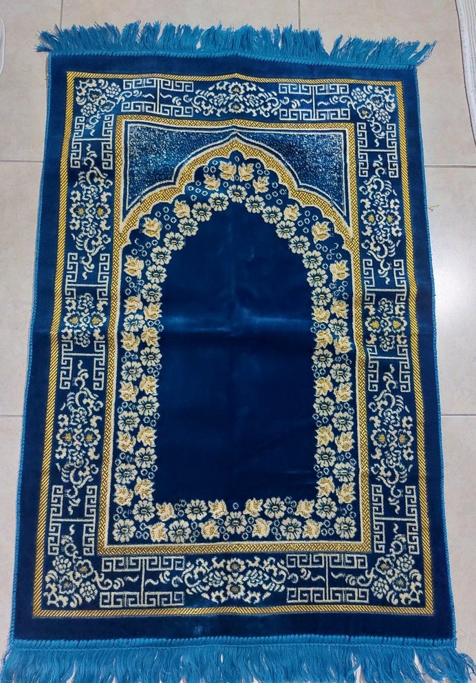 Mavi renkli seccade. Çiçek motifleri ve püskülleriyle klasik bir dokunuş sağlar.