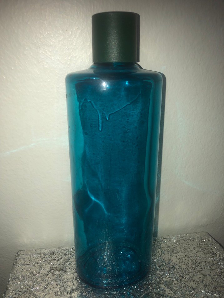 Koyu yeşil kapaklı mavi şeffaf kolonya şişesi