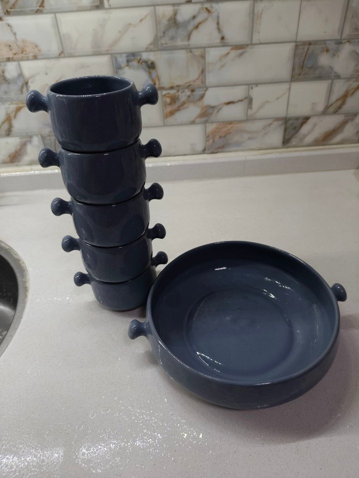 Mavi renkte, küçük kulplu seramik tabak ve kase seti. Geleneksel tarzda, kullanımı kolay kulpları bulunur. ️