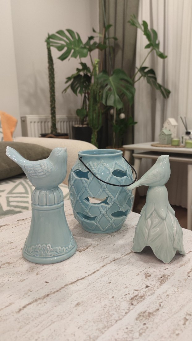 English home Hafif mavi seramik kuş figürleri ve çiçek desenli dekoratif fener, mekana zarif bir dokunuş katar. ️