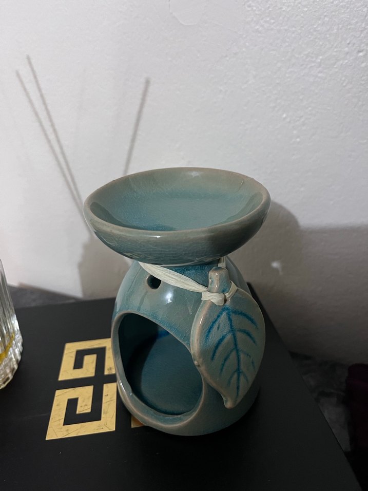 Yaprak detayı olan mavi seramik mumluk, üst kısmında mum veya yağ koymak için tabak bulunur. Açık mavi, pürüzsüz bir yüzeye sahiptir. Kullanılmadı sıfır kutusu ile gönderim yapılacaktır