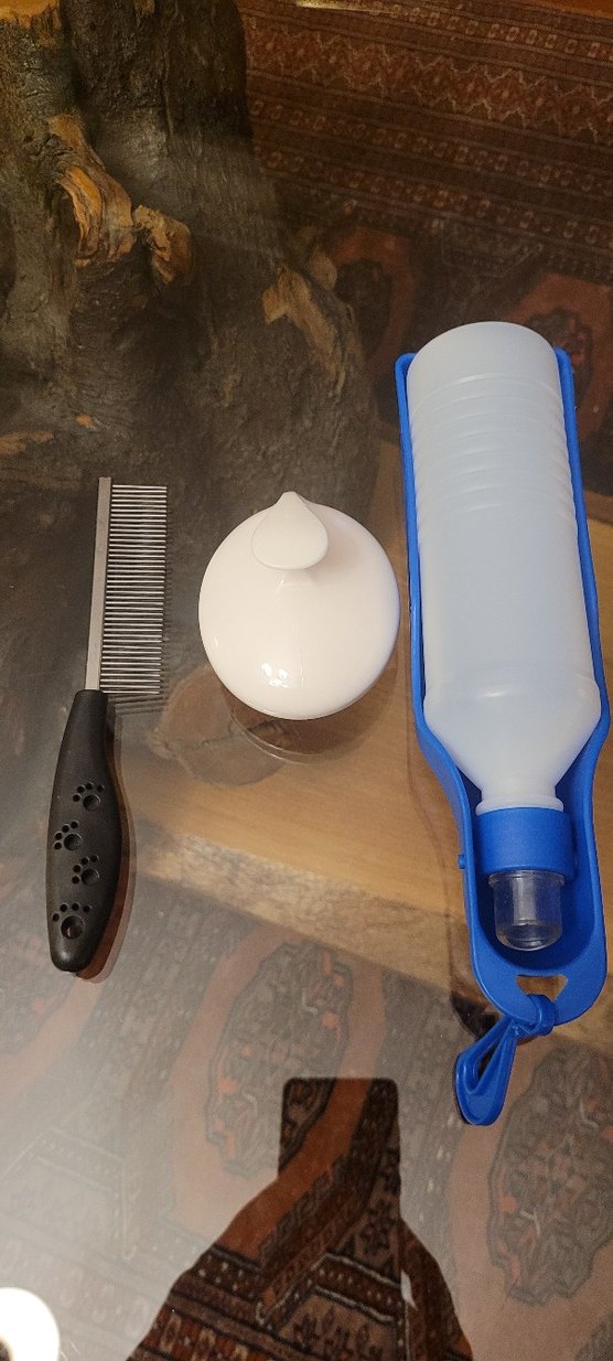 Mavi seyahat kedisi su şişesi, pati desenli tarak ve beyaz dağıtıcı. Evcil hayvan bakımı ve su ihtiyacı için uygun.