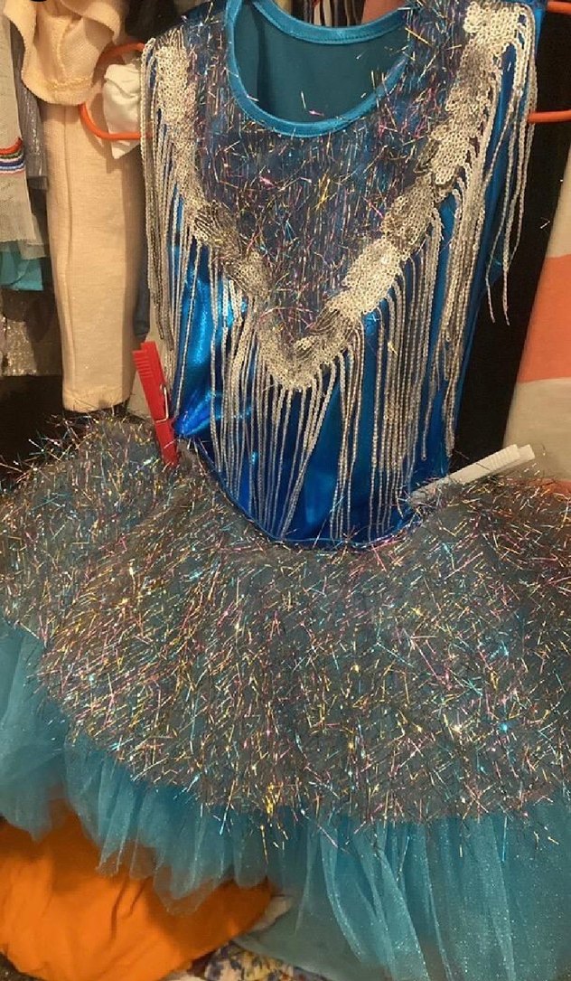 Mavi, simli, halter yakalı, kolsuz ve vücuda oturan çocuk kostümü. Body-tayt ve tütü 3 parçadır. Sentetik kumaştan üretilmiştir. ✨
