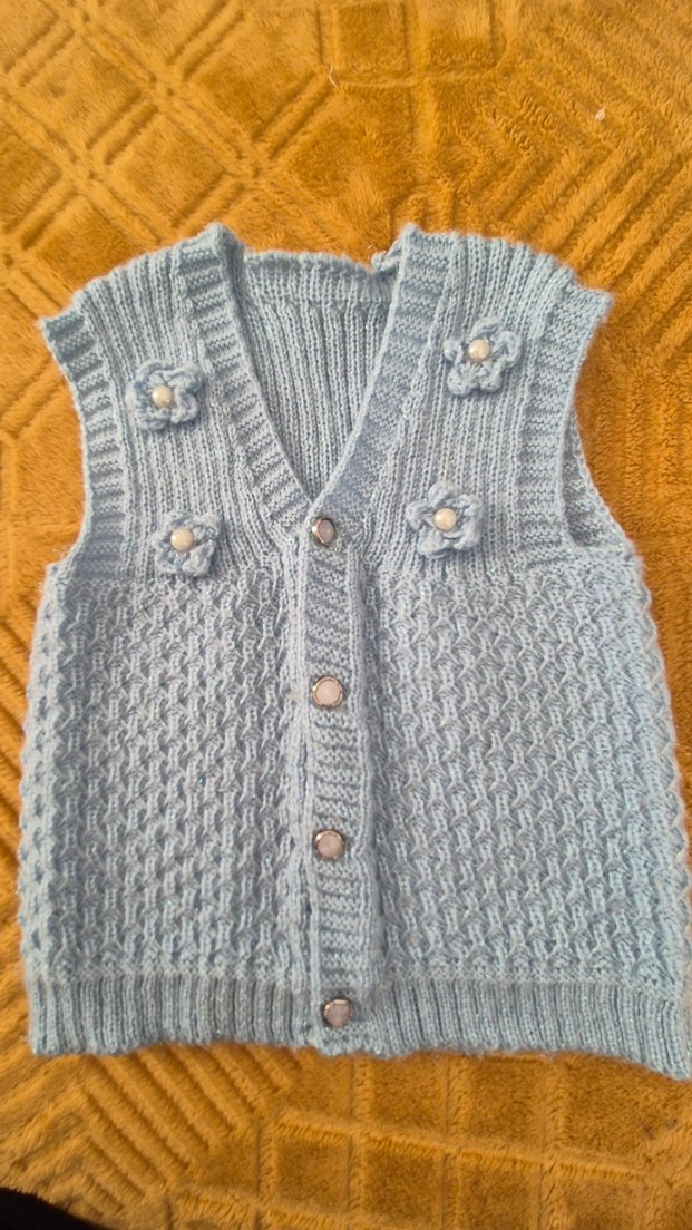 mavi simli örgü kız bebek yeleği, ölçüleri görsellerde mevcuttur