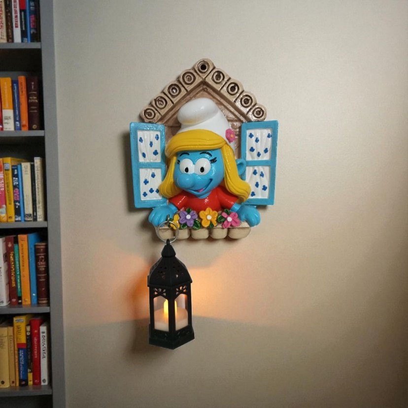 Canlı renklerde mavi Şirin figürü, elinde sıcak ışıklı bir fener tutuyor. Pencere çerçevesi ve çiçek detaylarıyla duvara asılır.