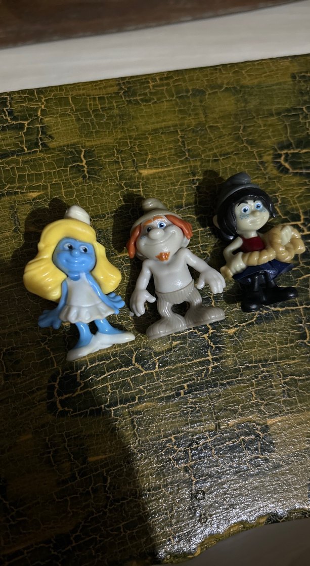 Mavi ve koyu renklerde, farklı özelliklere sahip üç aksiyon figürü. Koleksiyon ve hayranlar için uygun. Şirinler figür. Şirinler koleksiyon