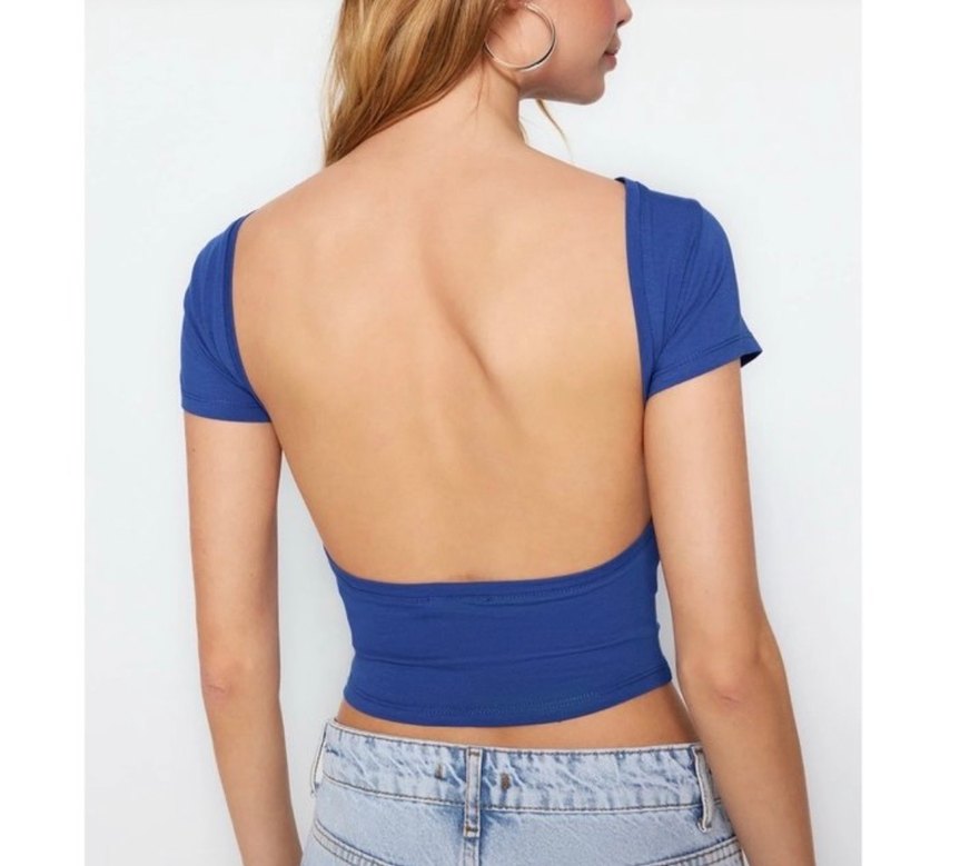 Mavi renkli, kısa ve sırt dekolteli crop top. Denim kumaştan, strappy kollu ve cesur athleisure tarzında, outdoor kullanıma uygun.tertemiz 2 kere giyildi stradivarius marka etiketi kesik