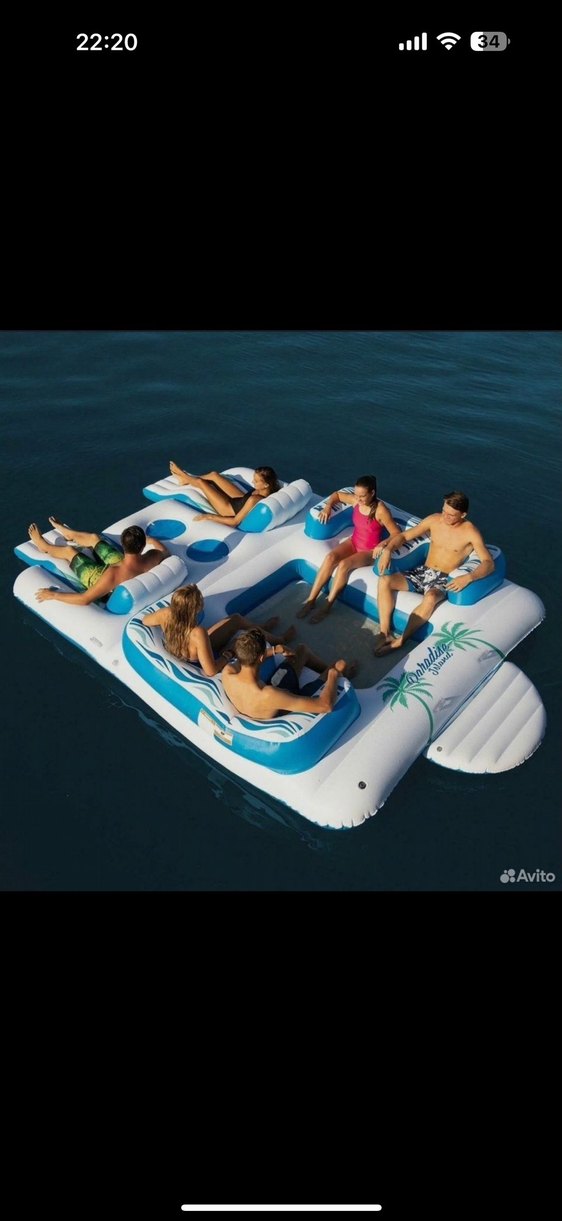 Açık mavi renkte, çoklu oturma alanları ve sırt dayanakları bulunan büyük şişme plaj ve havuz ürünü. Ortasında soğutucu alan içerir. ️420 santim