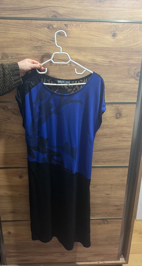 Uzun, salaş kesim elbise kısa kollu ve yuvarlak yakalıdır. Mavi ve siyah baskılı, drapeli tasarıma sahiptir, sokak tarzı için uygundur.