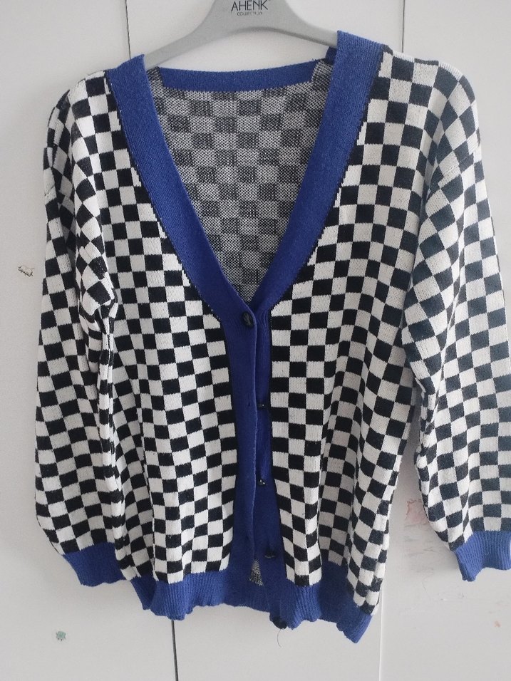 Mavi ve siyah beyaz kareli desenli, V yakalı, uzun kollu, bol kesim triko kadın hırka. Rahat sokak stili için uygundur.