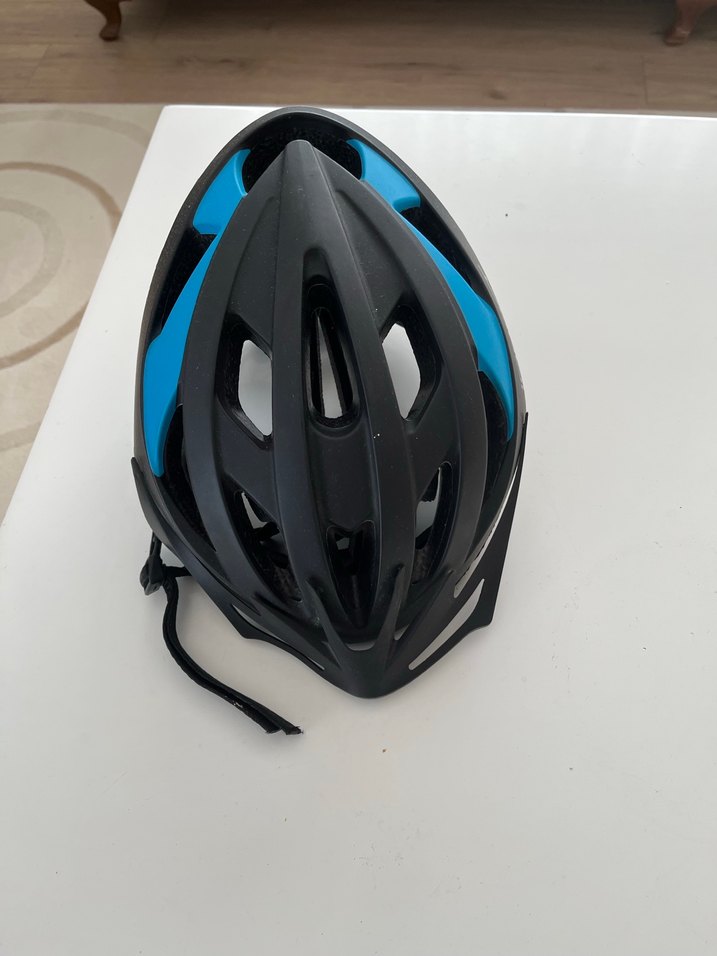 Bu biker motosiklet kaskı, mavi siyah plastik yapıya ve Velcro kayışlara sahiptir. Desensiz, modern tasarımıyla dikkat çeker. ️
