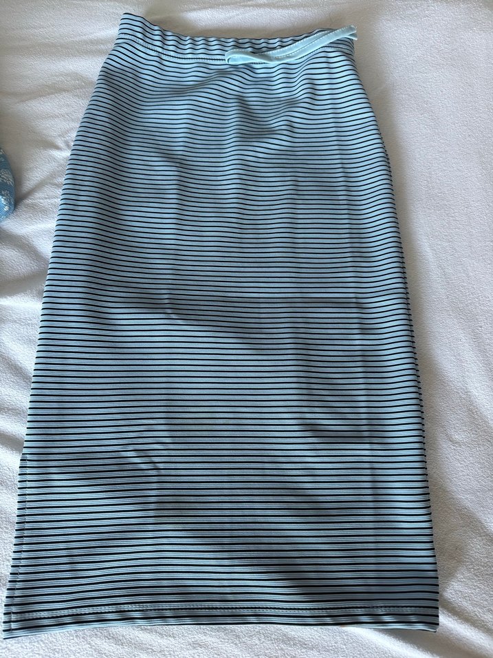 Bu pilili, çizgili desenli , mavi ve siyah renklerde, midi boyda ve sentetik kumaştan üretilmiştir. Günlük sokak stiline uygundur.
