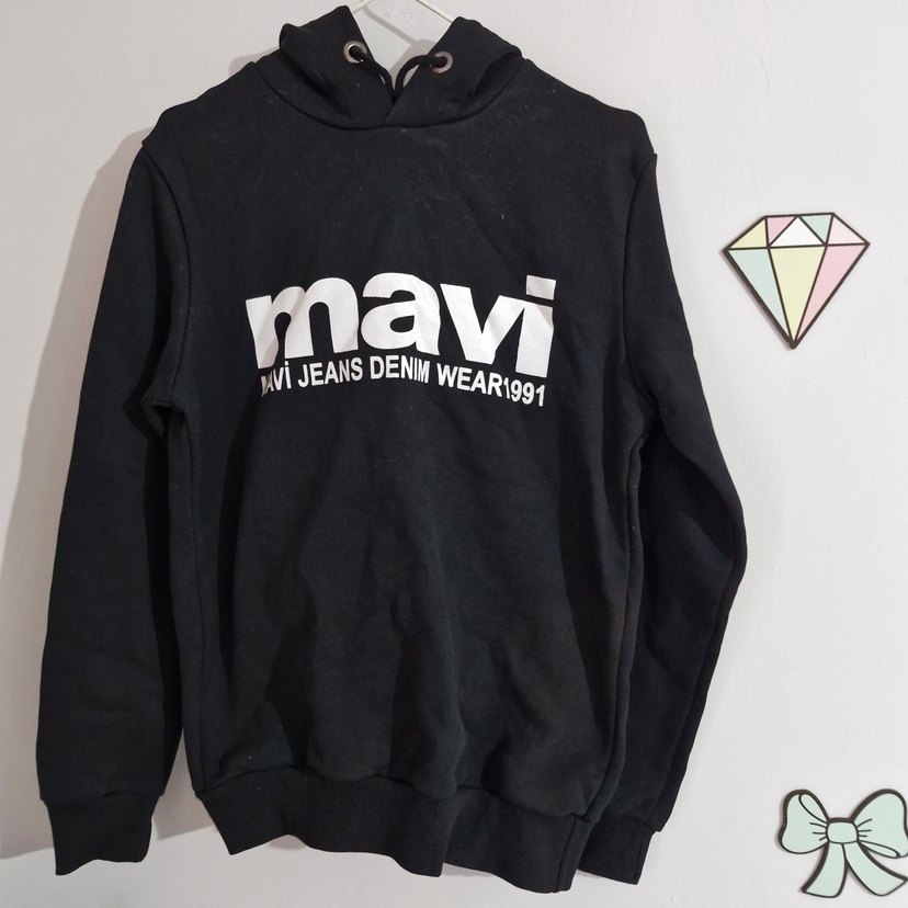 Siyah denim sweatshirt, uzun kollu ve bisiklet yaka, bol kesim ve baskılı logo ile. Velcro detaylı, rahat kullanım için uygun.