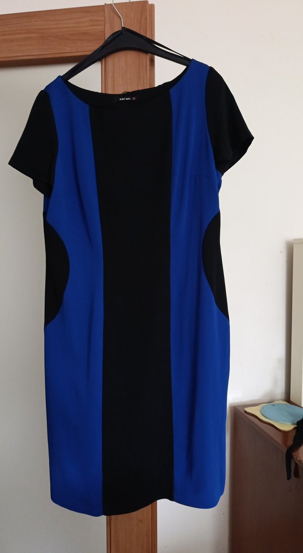Drapeli tasarımıyla mavi ve siyah renklerde, kısa kollu ve bisiklet yaka, ofis için uygun, vücuda oturan midi kalem elbise.