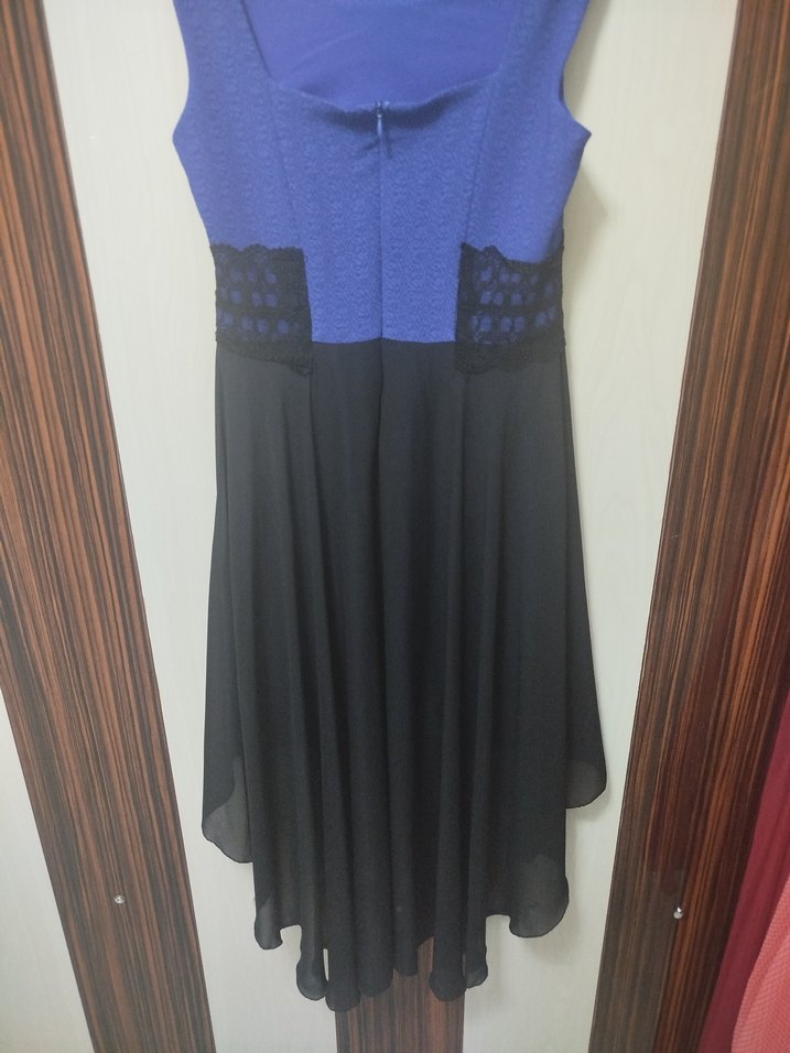 Mavi askısız üst kısmı ve V yaka detaylı, siyah drapeli midi etekli, fitted kesim gotik tarzda kadın elbise. Ofis için uygun.