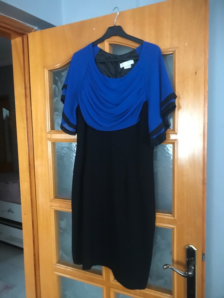 Fitted kesim, drapeli kayık yaka ve kısa kollu kadın abiye elbise. Koyu mavi ve siyah renklerin baskılı deseniyle gotik ve avangart tarzı yansıtıyor. Bayan şık abiye elbise ürün sağlam ve temizdir herhangi bir sıkıntısı yoktur sayılı giyildi 42 beden