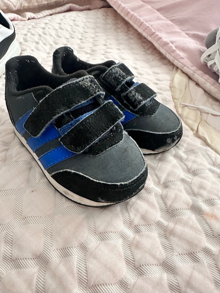 Koyu mavi ve siyah renkte, cırt cırtlı bantlara ve kauçuk tabanlara sahip erkek çocuk spor ayakkabısı.