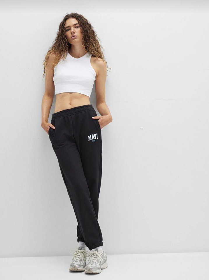Siyah pamuklu, bol kesim ve normal boyda eşofman altı. "MAVI" logosu bulunur, rahat ve sportif bir görünüm sunar.