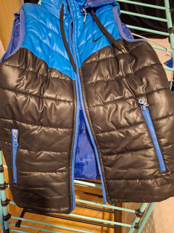 Kapitone, mavi ve siyah renklerde, fermuarlı cepli, kolsuz spor yelek. Dar kesim ve yakası notched lapel tarzında. ♂️ fermuarı bozuk başka kusuru yok