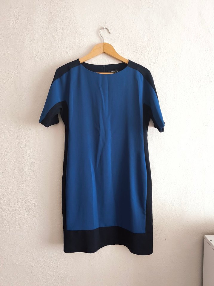 Kısa kollu, yuvarlak yakalı, rahat kesimli mavi-siyah midi elbise, ofis için şık ve sade bir seçenek sunar. çok şık hiç bi sorunu yoktur.