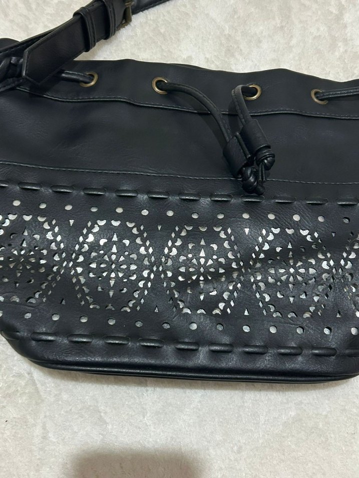 Siyah deri kadın çanta, tokalı ve nakışlı gotik desenli, bohem ve retro tarzlara uygun. Günlük kullanım için ideal.