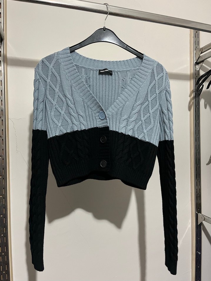 Mavi ve siyah renklerde, kısa kesim, uzun kollu örgü mini hırka. Rahat ve şık sokak stili için uygundur.