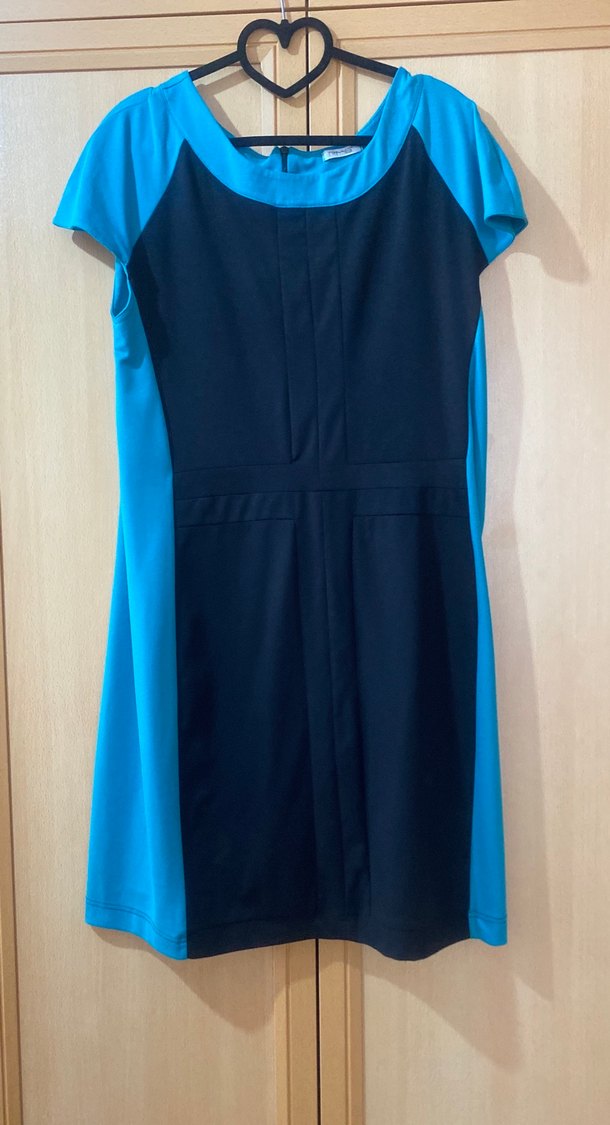 Bu elbise, yuvarlak yaka, kısa kollu ve piliseli detaylara sahiptir. Regular kesim ve midi boyda, koyu mavi ve siyah renklerle ofis için uygundur. Yumuşak sentetik kumaştan yapılmıştır.