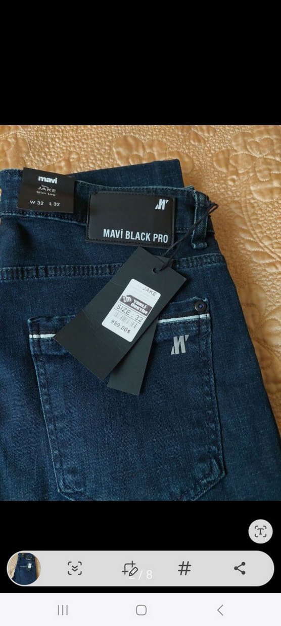 Mavi Black Pro markalı, kemerli, regular fit, koyu renk baskılı kot pantolon. Günlük sokak stiline uygun, normal boyda, W32 L32 beden.