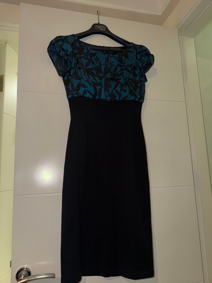 Dar kesim uzun elbise, straplez yaka ve kısa kollu. Üst kısmı mavi yaprak desenli, drapeli, alt kısmı siyah düz renktedir.