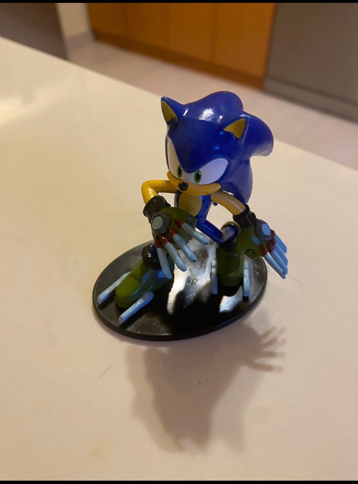 Mavi Sonic aksiyon figürü, detaylı eldivenler ve ayakkabılarla yuvarlak siyah tabanda duruyor. Canlı renklerle karakterin dinamik duruşunu yansıtıyor. Hiçbir sıkıntısı yoktur