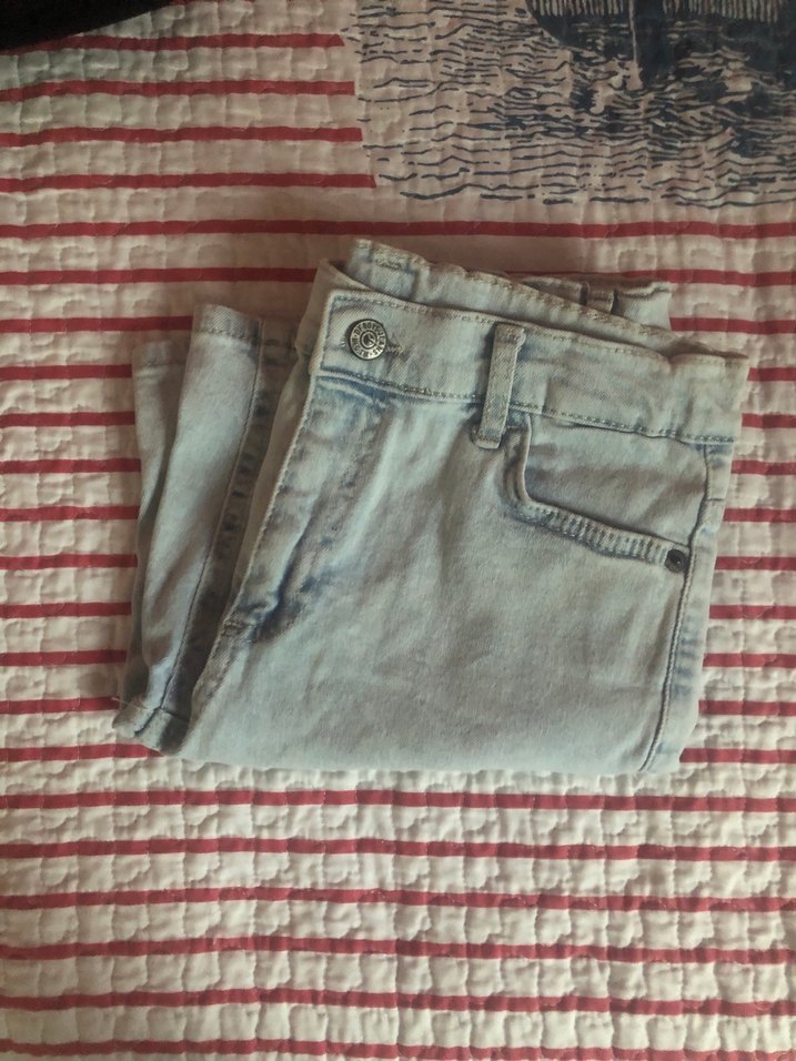Beli lastikli 14 yas olarak gosteriyor etikete Mavi renkli, düğmeli bel ve midi boy kesime sahip, kullanıma uygun, fitted kesim kadın kot pantolon. Desensiz, trend ve counterculture tarzında.