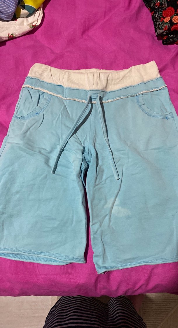 Pastel mavi renkte, pamuklu, bol kesim ve belden bağlamalı şort, günlük rahat kullanım için uygundur.